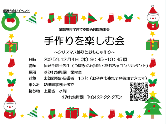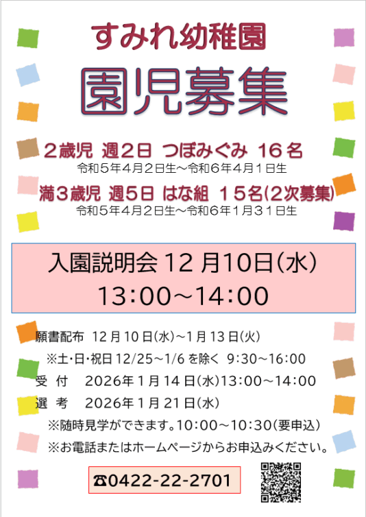 すみれ幼稚園は令和6年度から 「とうきょうすくわくプログラム」に参画しています。 子どもたちが好奇心や興味をもって、 わくわくしながら遊び学べるような活動を行っています。…